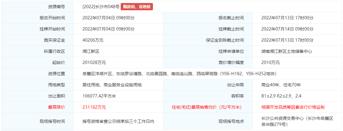 7月14日,长沙迎来2022年第二批集中供地,位于岳麓区的[2022]长沙市048号地块在经过17笔竞价后遭遇熔断,住宅毛坯限价根据开发品质等因素进行价格监制。