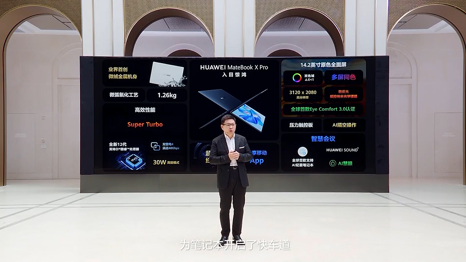 此次发布会带来了2款笔记本新品,华为发布典藏版笔记本华为MateBook X Pro首创微绒金属机身,14.2英寸的机身采用镁合金材质(仅微绒典藏版),整机轻至1.26kg,搭配14.2英寸3.1K分辨率的原色全面屏,10.7亿色、P3及sRGB双色域平均ΔE<1的高色准,获得了德国莱茵 TÜV 专业级双色域色准认证,硬件方面采用的是12代英特尔酷睿处理器,首发AI纪要功能,可以实时转写为文字。普通版本价格是8999元起,典藏版价格是11999元起。