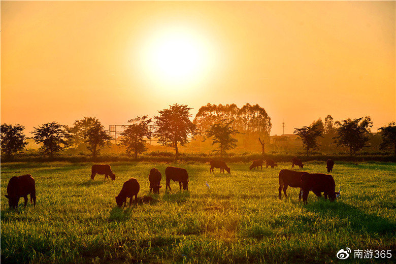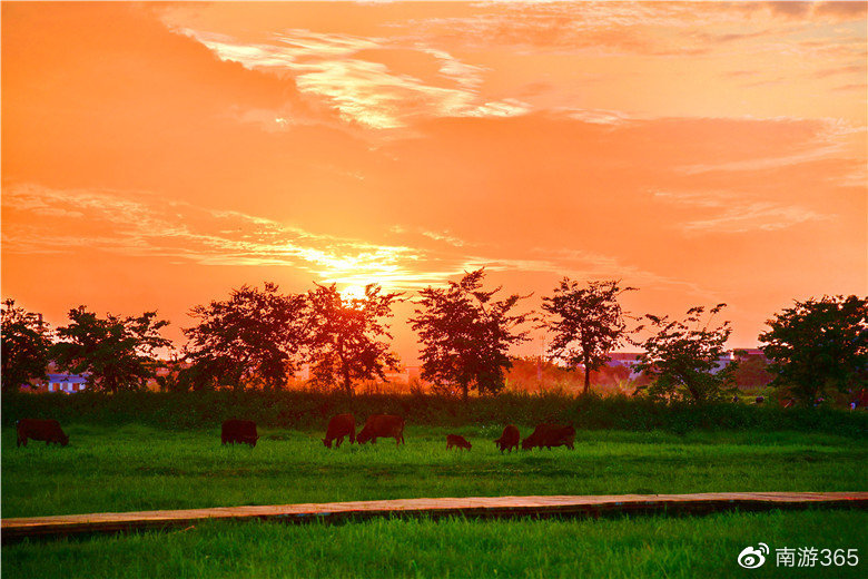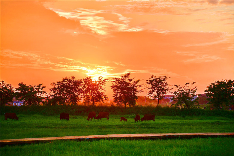 牧场最美丽的时刻是黄昏,西沉的夕阳留恋牧场的美景,贪恋牛马的可爱,有一个小时的夕阳彩霞美景时光让人沉醉。夕阳从牧场的西边缓缓西下,越来越圆,越来越大,光芒慢慢变得通红,整个牧场笼罩上了一层金光。夕阳的余晖洒在牛群身上,黄牛变成了金牛。田园、夕阳、彩霞、草地、栈道、木屋、牛群构成了一幅如诗如画的图画。