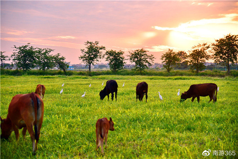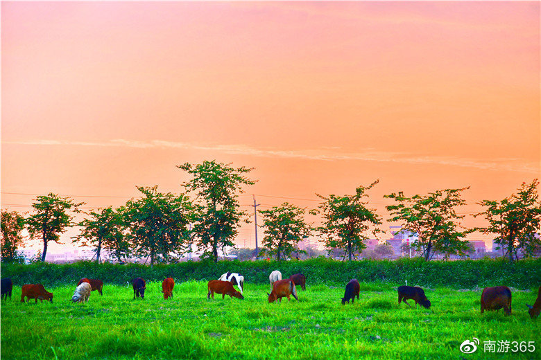 在广州这个现代化大都市里,竟然深藏着一处如同北国那样的草原牧场美景,来看过的游客都说有点不相信自己的眼睛。这个牧场就是位于增城区石滩镇三江向东大道的幸福田园犇牛牧场。无人机镜头下,草地连成一片,牛马悠闲地吃草嬉戏,洁白的鹭鸟栖息在旁边。最美的时候是黄昏,夕阳西下,彩霞满天,牧牛晚归,如诗如画。