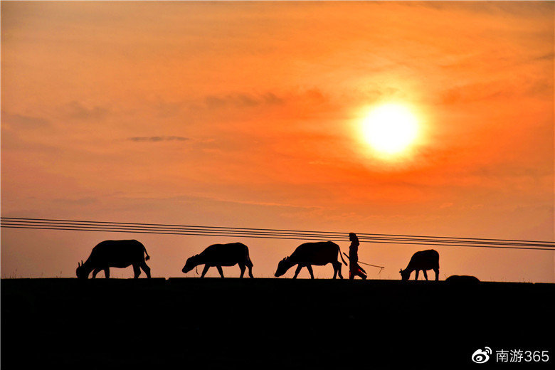 牛群恋上黄昏美景,迟迟不肯归巢,牧牛人怎么吆喝,牛群仍然慢腾腾,时而吃草,时而抬头望着满天的彩霞。一直到夕阳快要落到地平线下,才恋恋不舍地回牛棚。晚归的老牛,百万重的暮色,掠过的飞鸟,翩翩的白鹭,让牧场的黄昏充满了诗情画意。
