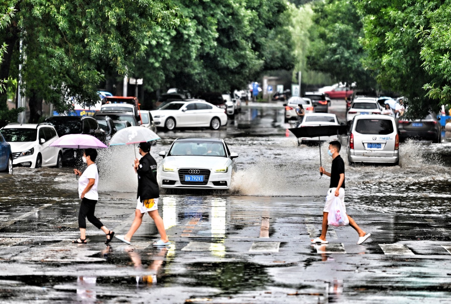 7月27日,北京朝阳迎来降雨天气,市民正通过积水路面。 新京报记者 陶冉 摄