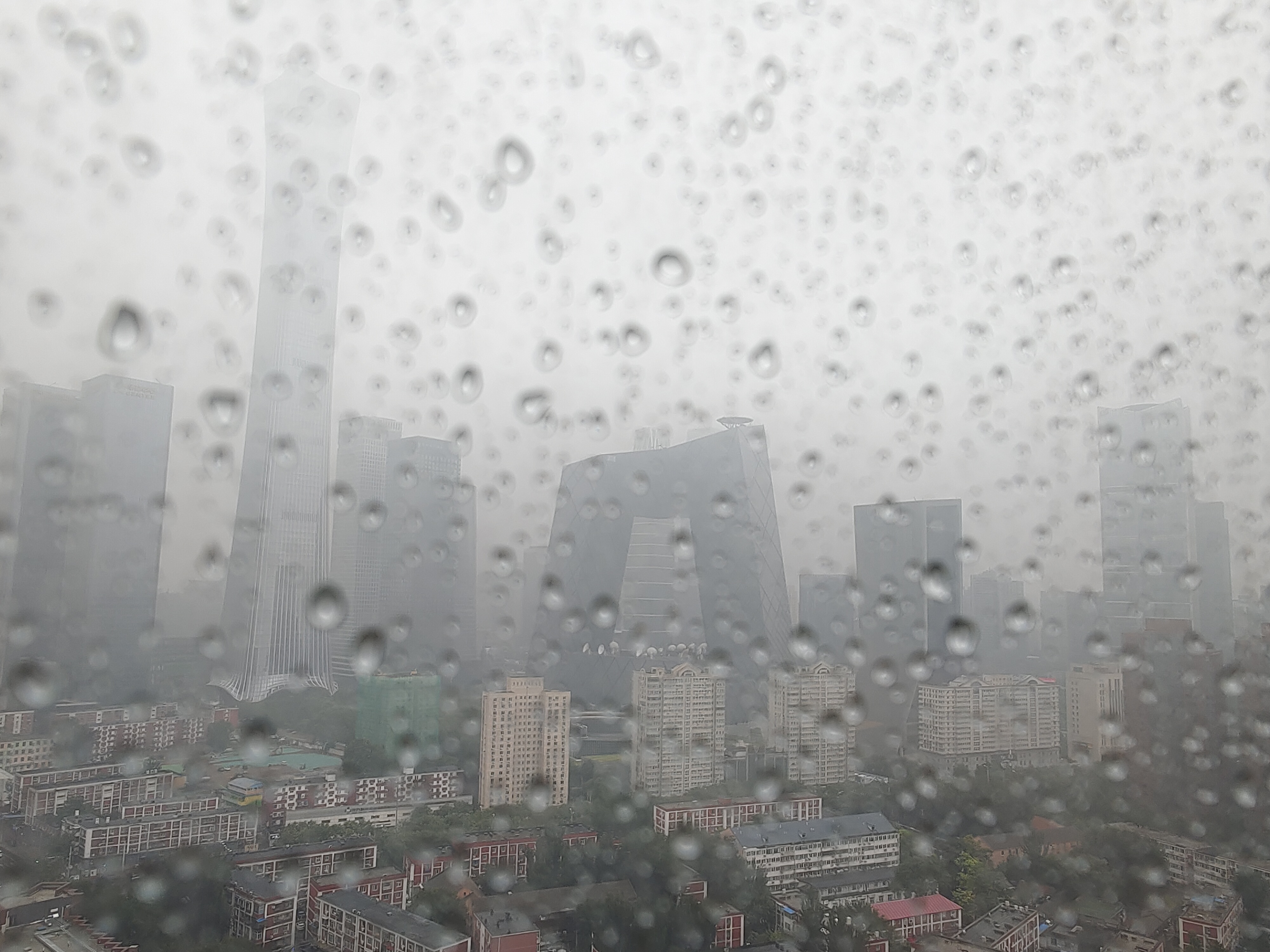 7月27日,北京国贸CBD,北京迎来降水天气,并伴有雷电,中国尊、央视大楼等地标建筑被阴雨和雾气笼罩。图/IC photo