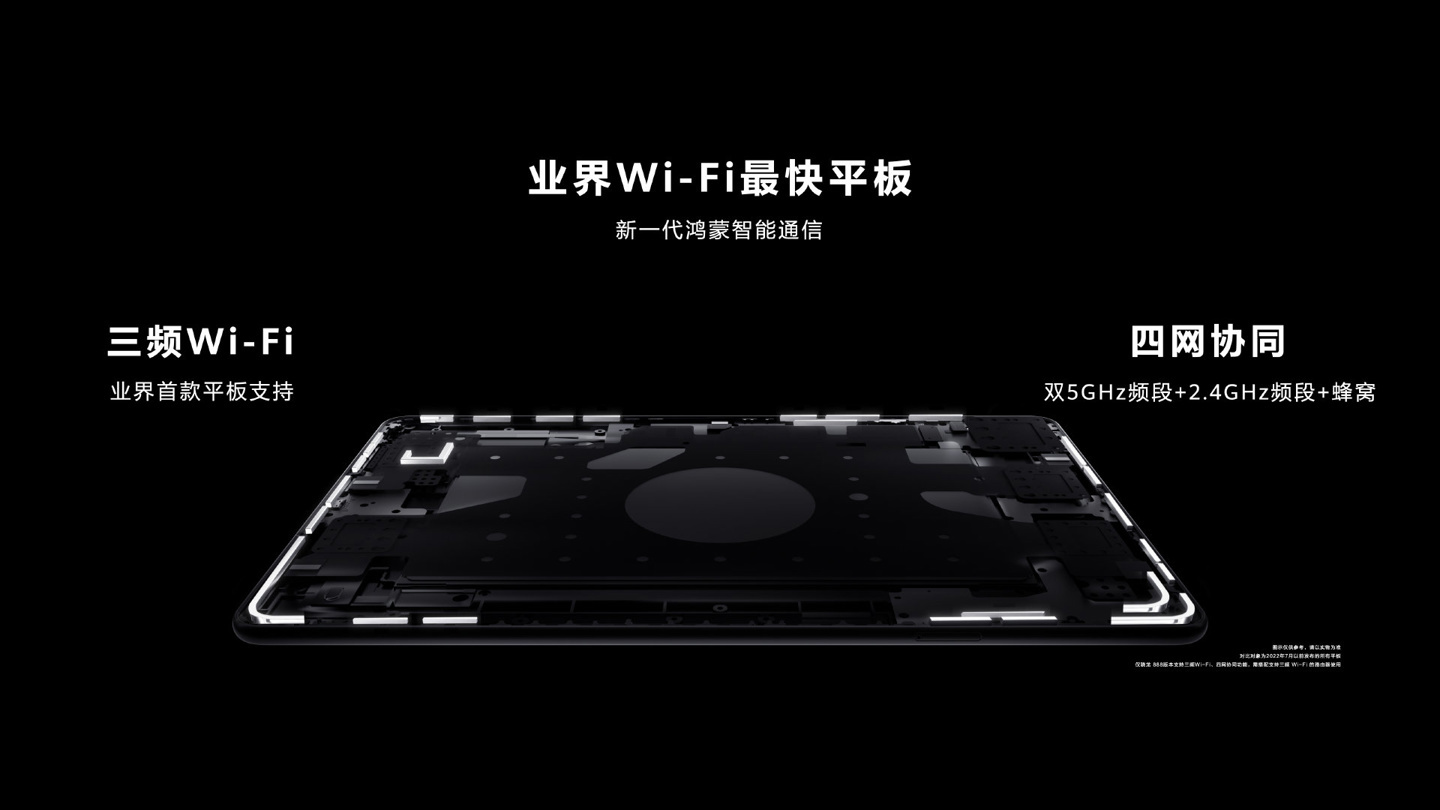 此外,该平板配备六单元扬声器,支持 HUAWEI SOUND。该平板还支持环绕式隐身天线,支持三频 Wi-Fi,四网协同最高网速可达 5.2Gbps。摄像头前置 1600 万像素,后置 1300 万像素主摄 + 800 万超广角。