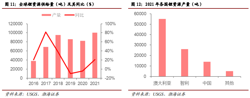 渤海证券引述USGS的数据,2021年全球锂资源供给量约10万吨。