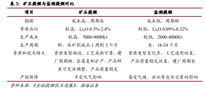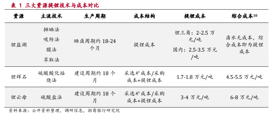 与矿石提锂相比,当前 盐湖提锂 主要表现为生产成本低,但生产周期长,产能保障差。随着技术发展及成熟,未来盐湖提锂会有进步。