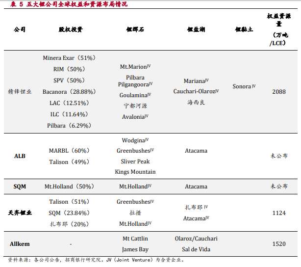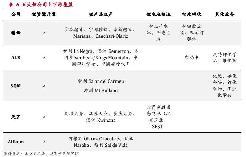 当前市值前五大的公司赣锋锂业、ALB、SQM、天齐锂业、Allkem14均在全球布局锂资源,拥有多种类型的锂资源。