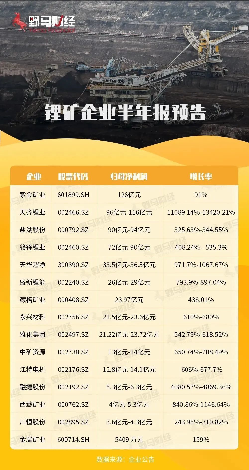 近日,野马财经总结了部分发布半年报预告的锂矿企业业绩: