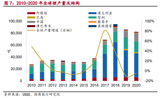 招商银行研究院介绍,锂矿产量集中于澳洲、智利和我国,产量主要来自于锂辉石和盐湖。2020年,除去美国外,全球产量为 8.28万吨,较2019年下滑4.7%。
