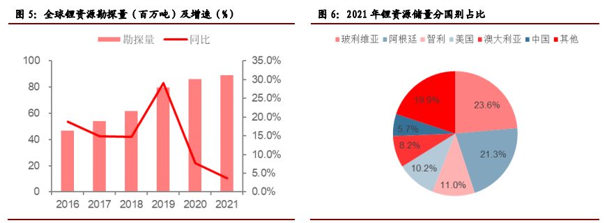 渤海证券研报则说,2021年全球已探明的 锂资源量达到8900万金属吨 ,在高需求刺激下,随着勘探的持续以及开采技术的更新,预计总量将会继续提升。