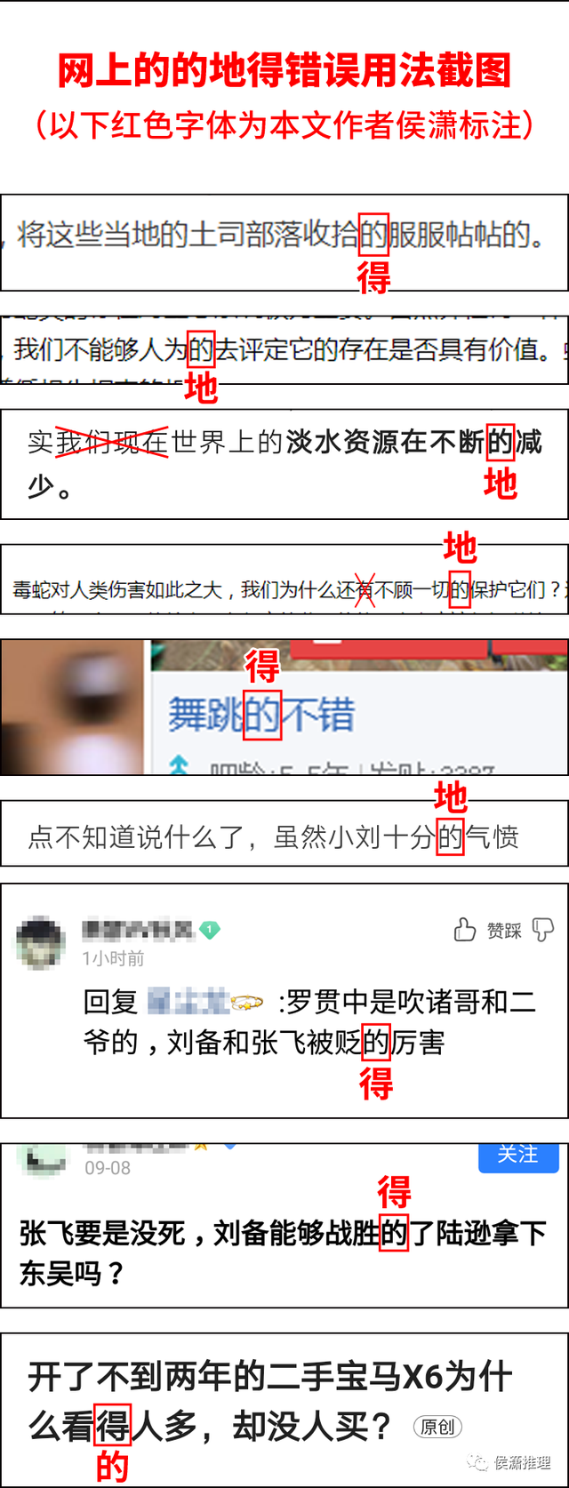网上的的地得错误用法截图,红色字体为本文作者侯潇标注