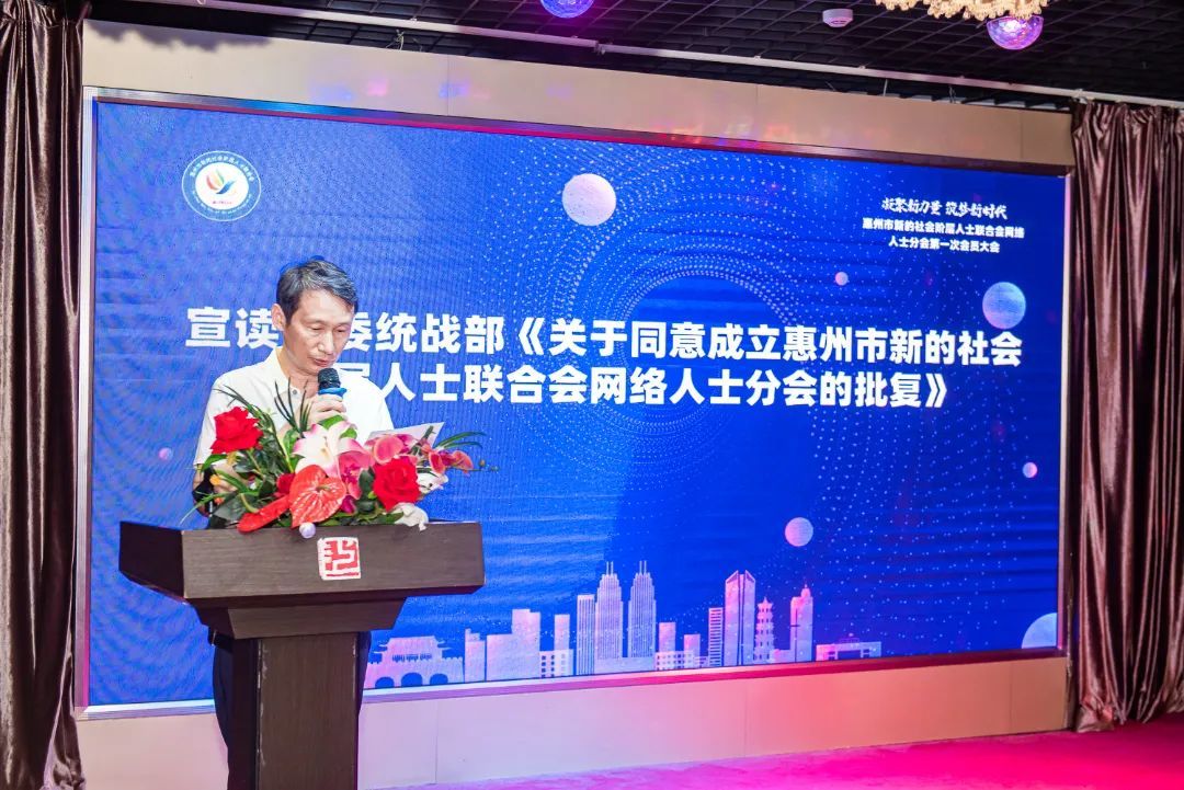 ▲市委统战部二级调研员林小彰宣读市委统战部《关于同意成立惠州市新的社会阶层人士联合会网络人士分会的批复》