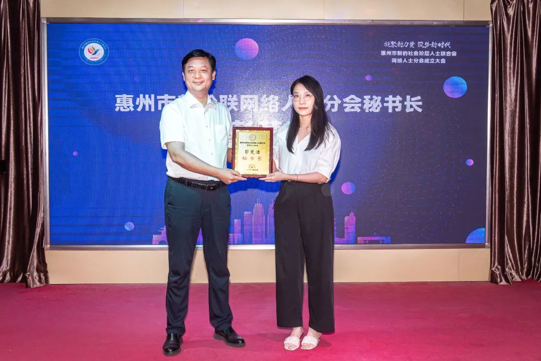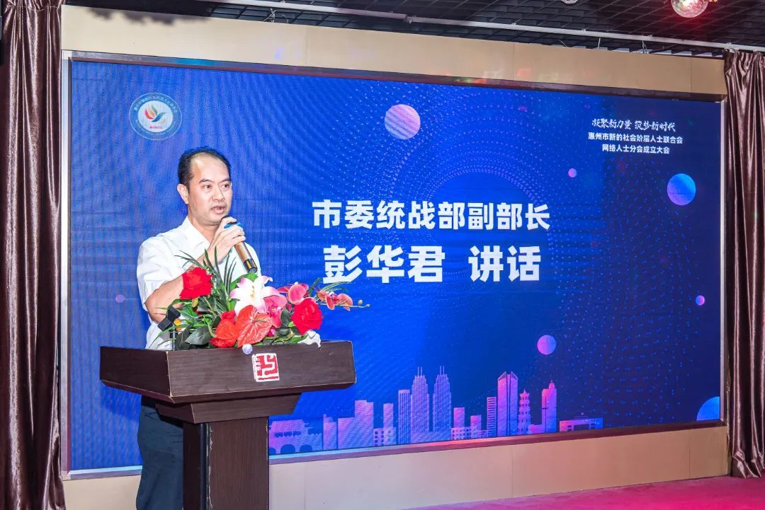彭华君代表市委统战部对惠州市新阶联网络人士分会的成立表示祝贺。他指出,网络人士分会成立是我市网络人士统战工作的一件盛事,标志着惠州网络人士统战工作站在一个新起点,也标志着我市新的社会阶层人士队伍建设进入一个新阶段。希望网络人士分会要突出政治引领,凝聚思想共识,构建网上网下同心圆,进一步坚定与党同心同德、同向同行、携手共进的政治方向,以实际行动忠诚拥护“两个确立”,坚决做到“两个维护”;要树立一盘棋思想,突出服务大局,聚焦发展动能,成为线上线下的生力军,把建言资政的好点子化为助推发展的好路子,多为市委市政府建良言献良策,努力为惠州建设更加幸福国内一流城市贡献更大智慧和力量;要加强自身建设,坚持发展和治理相统一、网上和网下相融合,在完善机制、建设队伍、树立形象上下功夫见成效,努力打造网络人士的“温馨家园”,扎实推动我市网络人士统战工作高质量发展,以实际行动迎接党的二十大胜利召开。
