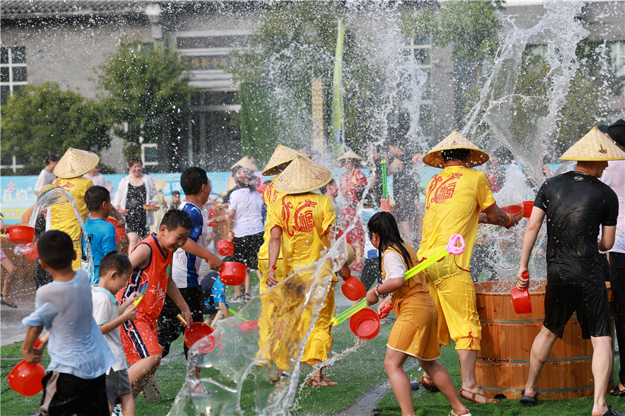 国家AAA级景区秦巴风情园,是石泉的网红打卡点之一,随着泼水祈福节活动在此地的持续开展,更是游人如织、热闹非凡。活动现场,惊险刺激的泼水大战不断上演,大人们带着孩童在场内奔走嬉戏,举着代表祥和美满的水盆、水瓢等道具齐上阵,尽情泼洒,欢呼声、尖叫声在风情园的上空汇成满满祝福,形成滴滴水珠洒落,着实让游客“清凉一夏”。