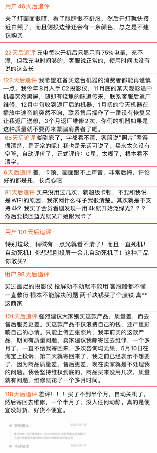 除了自动重启问题以外,《消费者报道》还留意到,用户还反映C2投影仪在使用过程中存在的质量问题也五花八门,如自动关机、异响、卡机、黑屏、花屏、网络连接失败、音画不同步、无声音、画质模糊、续航短、亮度低、用久后出现异味等等。