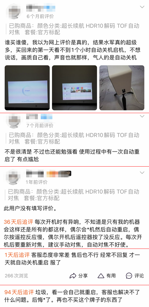 《消费者报道》注意到,当贝C2投影仪自动重启问题并非个案,在当贝天猫旗舰店C2投影仪的评论区中,已有不少用户反映过投影仪出现自动重启故障问题。