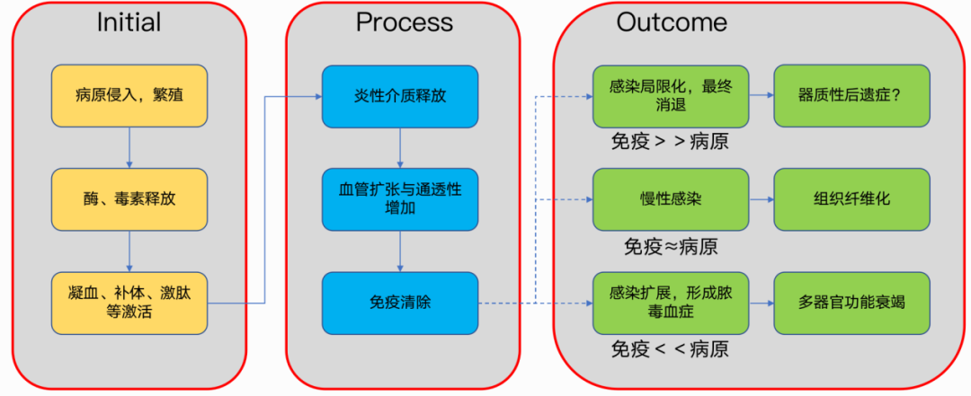 对于感染性疾病,领域内临床专家定义为病原+损伤,不仅要关注感染是何种病原微生物引起的,还要关注感染所导致的器官损伤。一般当病原体侵入后,大概有三种临床终局:① 宿主自身免疫状态很好,免疫力很强,能够清除病原,从而使感染局限化,最终消退,但也可能会引起一些器质性后遗症,如新冠;② 宿主自身免疫状态和病原处于一个微平衡状态,会引起一些慢性疾病,可能会引起一些组织纤维化,如乙肝;③ 当宿主自身免疫状态和病原无法平衡,引起病原的强力攻击,就会导致感染扩展,甚至多器官衰竭,如脓毒症。因此,针对感染性疾病,感染哪种病原体、宿主免疫状态以及造成的损伤程度均与疾病进展息息相关。
