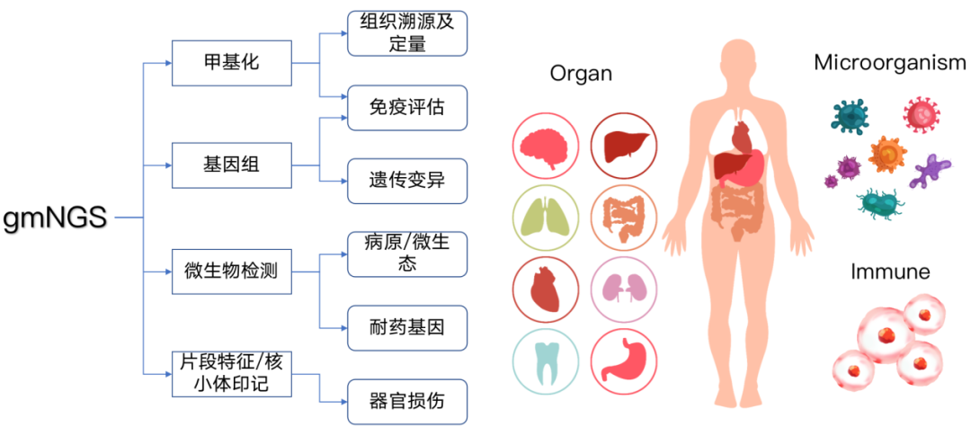 gmNGS技术,g为genomics,m为metagenomics,是指依托于GM-Seq技术、基于甲基化marker数据库和基线数据库的,在进行病原检测、评估感染情况的同时,分析宿主器官损伤和免疫状态,以评估人体反应,全面分析感染及感染后宿主的人体反应特征。