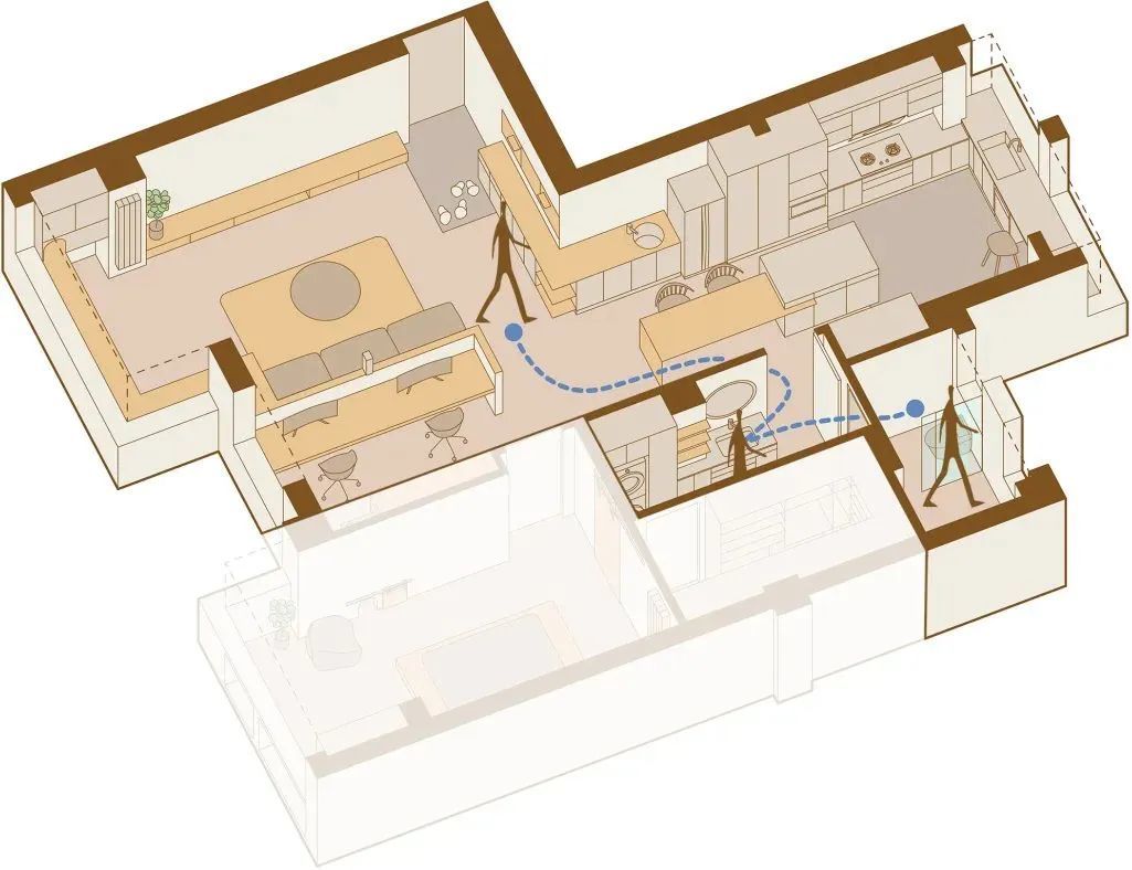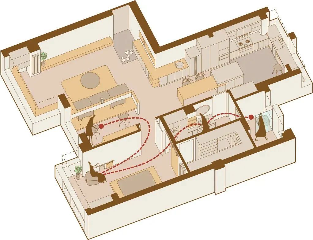 客人动线的主要活动区域是客厅、餐厅、卫生间。在保证便利性的同时,不必经过主卧和衣帽间等私密区域。