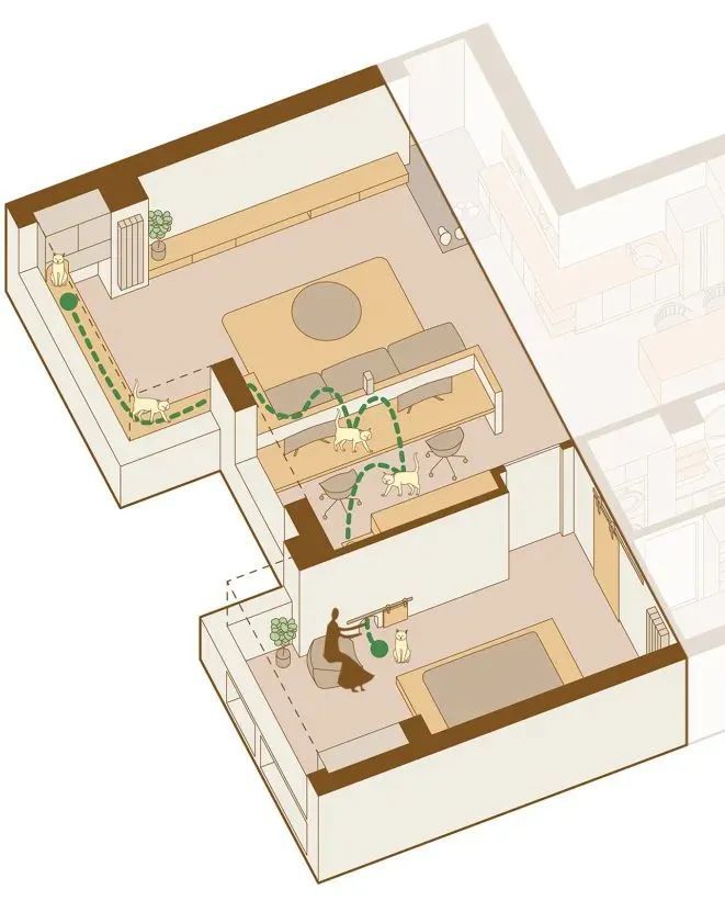 在设计师对空间重新布局之后,形成了“主人动线”、“客人动线”和“猫咪专属动线”。