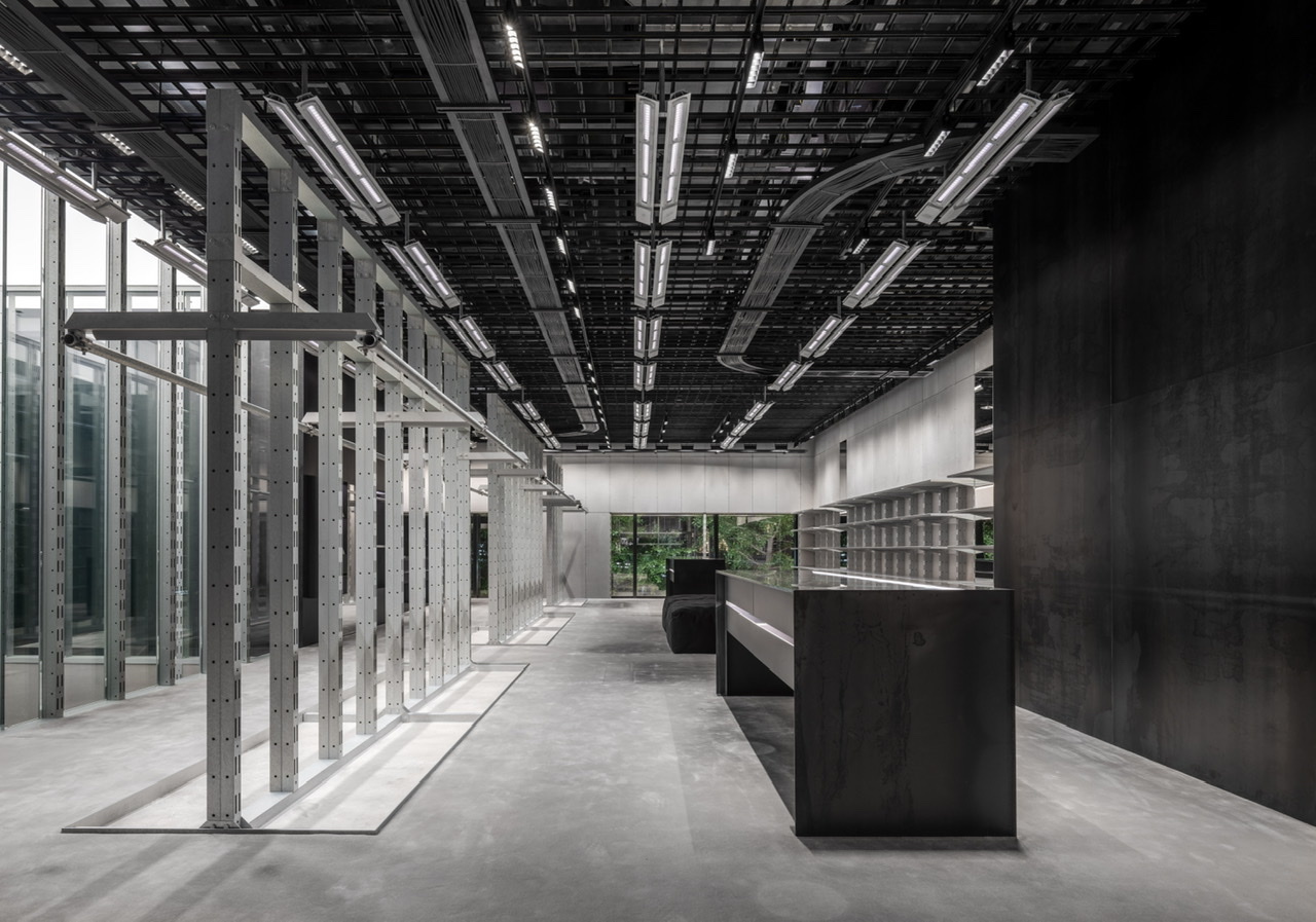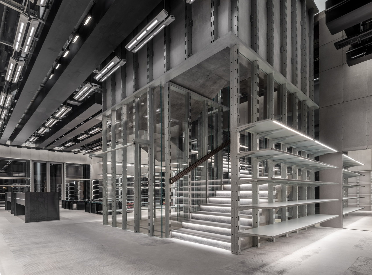 店内装潢刻意呈现一种“未完成”的状态,电缆、管道和通风系统一览无余,仅有局部用 网格天花板和工业照明系统进行遮挡。地面和墙面铺有特殊肌理的镶板,呈现磨损、带 有污渍或碎裂的效果;重型铝制陈列架的表面具有斑驳而粗糙的质感;人造皮革座椅被 设计的破损且变形。