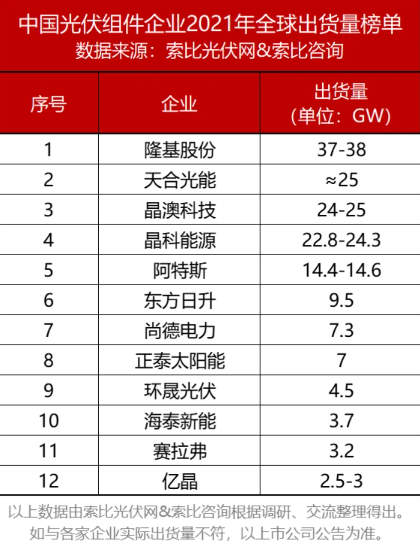 据索比咨询《中国光伏组件企业2021年全球出货量榜单》数据显示,中国光伏企业在全球出货榜上名列前茅,出货量合计约140GW,占全球组件总需求的75%以上,硅片的市占率高达97%,全球光伏各产业的榜单中,排名前十的几乎都为中国企业。