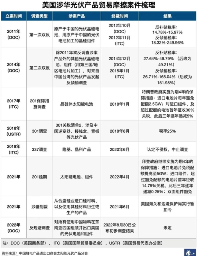 自2012年起,美国商务部曾对进口中国光伏产品作出反倾销、反补贴终裁;此后十年间,又先后叠加了“201”、“301”两项关税。高税率之下,多家中国光伏企业为了规避风险前往成本较低且位置最近的东南亚布局产能。