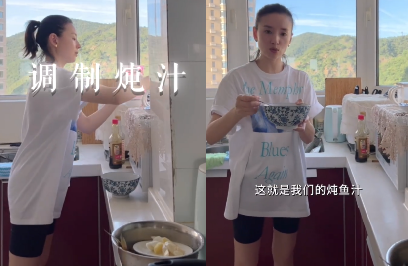 而后她还调制了一碗特别的炖鱼汁,应该是她自己的独家秘方。值得注意的是,当天董洁下身穿着一条紧身短裤,她的一双细腿格外抢镜。