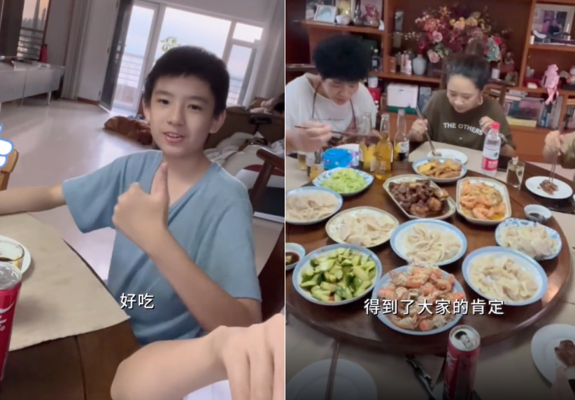 最后董洁父女俩做出了一大桌子菜,还煮了一些饺子,看上去十分丰盛。大家尝过之后纷纷夸赞。儿子顶顶也竖起大拇指,连连称好吃。