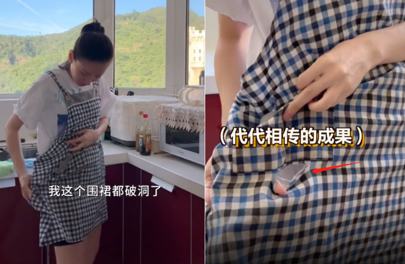 在准备开始炖鱼时,董洁穿上了围裙。但没想到围裙上居然破了一个洞,这样还在使用,也是非常节俭了。可以看到,董洁家厨房窗外景色很美,绿树青山让人身心舒适,在这样的景色下做饭,想必心情会更好。