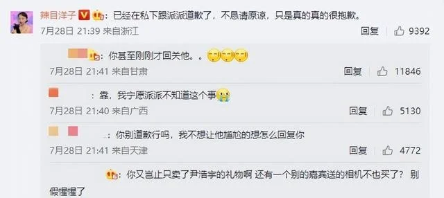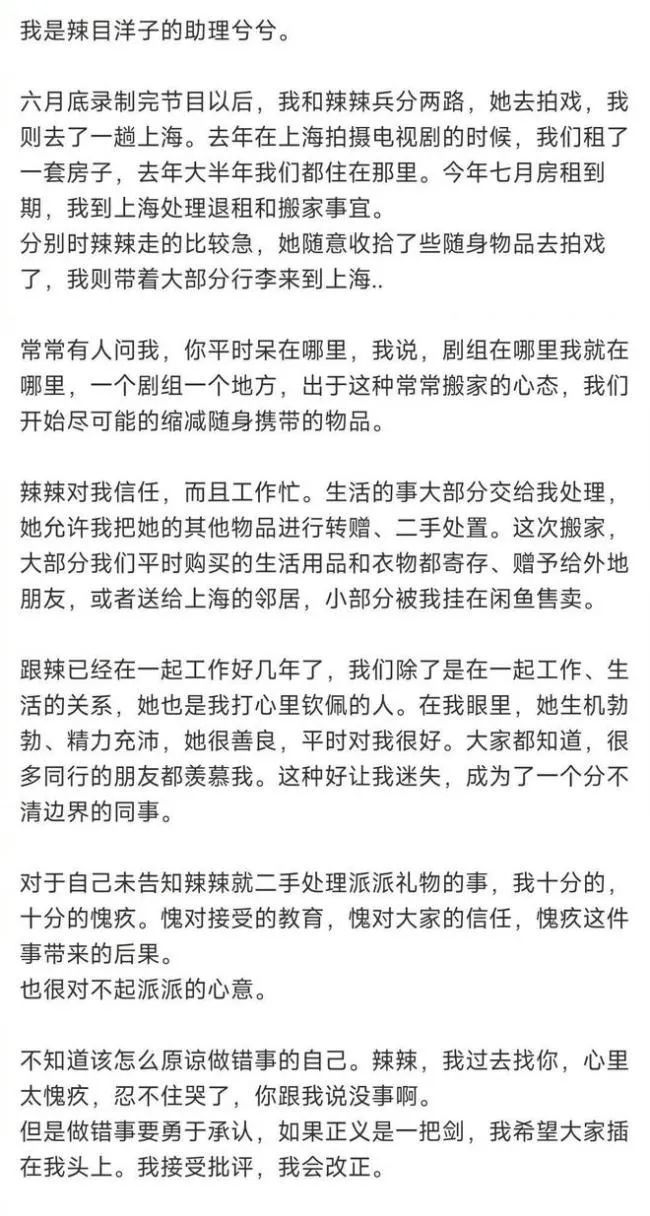 先是辣目洋子发文道歉,称是自己的疏忽,交给助理打理,结果没有保管好礼物。