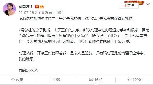 《把尹浩宇送的礼物误挂二手平台,辣目洋子道歉》,网易娱乐,2022.7.29