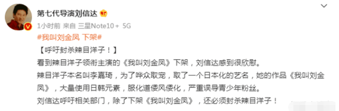 刘信达更是在社交平台发文要求封杀辣目洋子。