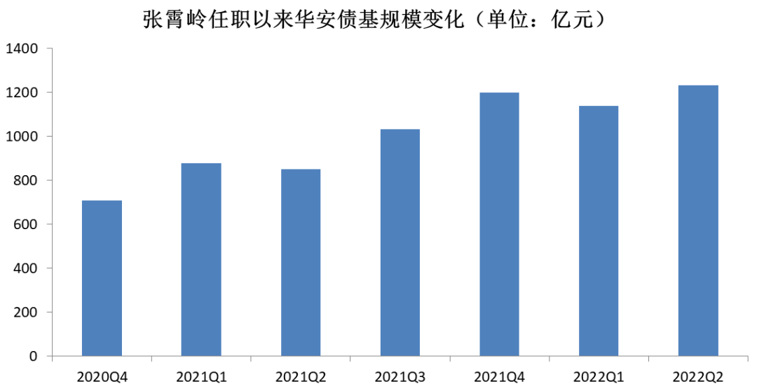 截至2022年二季度,公司旗下债基规模已经达到了1234.06亿元,较张霄岭上任之初的707.86亿元,增加了526.2亿元,增幅高达74.34%,在公司同类产品中排名第一。