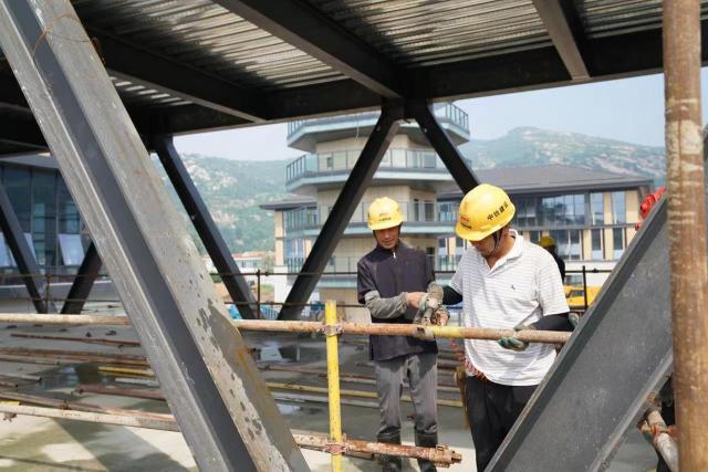 走进工地,首先映入眼帘的建筑便是游客中心,未来,这里将为游客提供咨询、行李寄存、休息、购票等各种服务。在游客中心两侧,分别是5、6号楼,大方简洁的外立面显得设计感十足,这里将建成“灵泉”“渔岛”主题酒店和特色餐饮、购物水街。沿着游客中心一路向北,矗立着渔湾游客中心建筑群的标志建筑——观光塔,这座塔与花果山景区大圣湖畔的阿育王塔高度一致,建成后将运用声光电等现代手段,打造网红地标景点。剩余的主体建筑也都脱下了“绿色外衣”,换上了“仿古服饰”。这8栋单体建筑将打造无水海洋馆、主题酒店、影院式康养理疗馆,咖啡、书吧、茶艺、酒吧等餐饮娱乐设施也一应俱全。