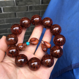 在对比的时候可以看芝麻纹手串的比重和手感,用手掂量黄花梨手串,质地坚实,颇有分量。因为油性重,触手则如玉般温润。