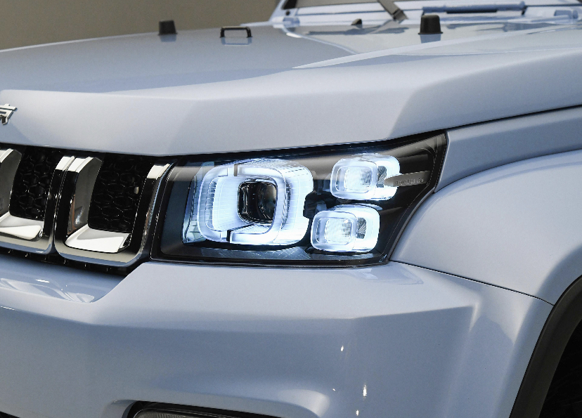 23款BJ40的外观设计复古又硬朗,车身线条比较平直简洁,前脸进气格栅采用经典的五方孔中网设计,并覆盖精致的银色镀铬作为装饰。分体式大灯上下造型都很方正,但是灯腔内的设计比较复杂,内部由200颗LED光源组成,给人的感觉粗中有细。尾灯造型同样如此,与前大灯相互辉映。
