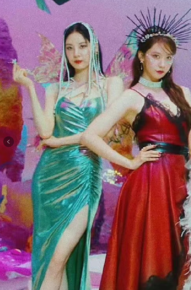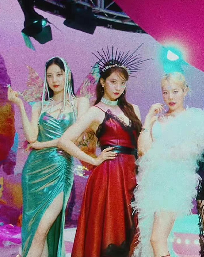 站在最左侧的三位分别是徐珠贤、林允儿、李顺圭,这三人的造型各有不同,却十分诡异。作为团内的高妹,徐珠贤原本可以好好地秀身材,可是造型师却给了她一款贝壳蓝色的反光紧身裙,头上还有样式奇葩的珠链头饰,拉低了颅顶高度,更加突出她的大圆脸,让她整个人尽显水肿感。另一边的李顺圭则是斜披着一件羽毛披肩,散发出90年代发廊小妹的土味感。对比前后照片,很难相信这款合影中的她们就是本人。