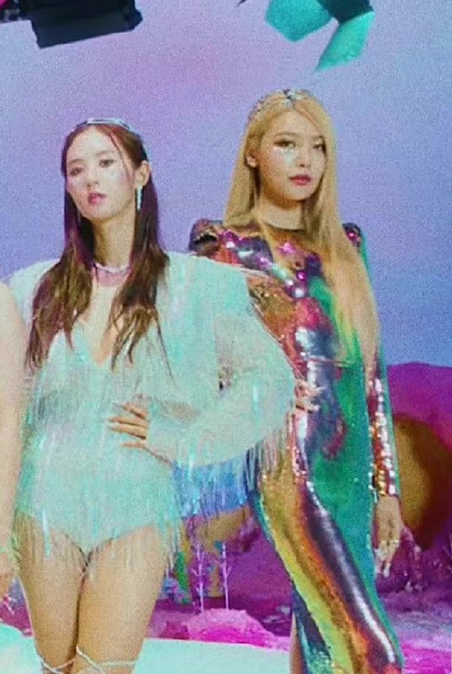 最后两位成员权侑莉和崔秀英,一个穿着彩带泳衣装,完全撑不起来,另一位穿着舞厅彩球服,整个人肿得离奇,让崔秀英瞬间增肥十几斤。粉丝们甚至调侃道,崔秀英的造型如同复制某款零食。而在这之前发布的回归照,崔秀英完全是标准的爱豆身材,看来韩娱造型师确实是毁人不倦啊。