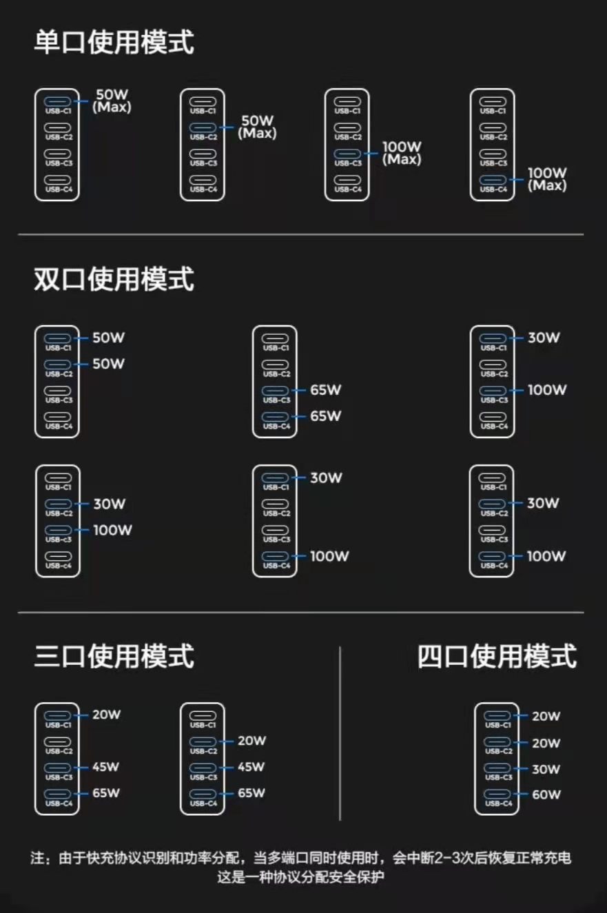 这款充电头在业界首次选用USB-C四口接口设计,而且每个充电口都支持独立快充,明细可看下表,针对不同设备专门设置不同功率输出,即使整体输出功率依然有绝佳表现。