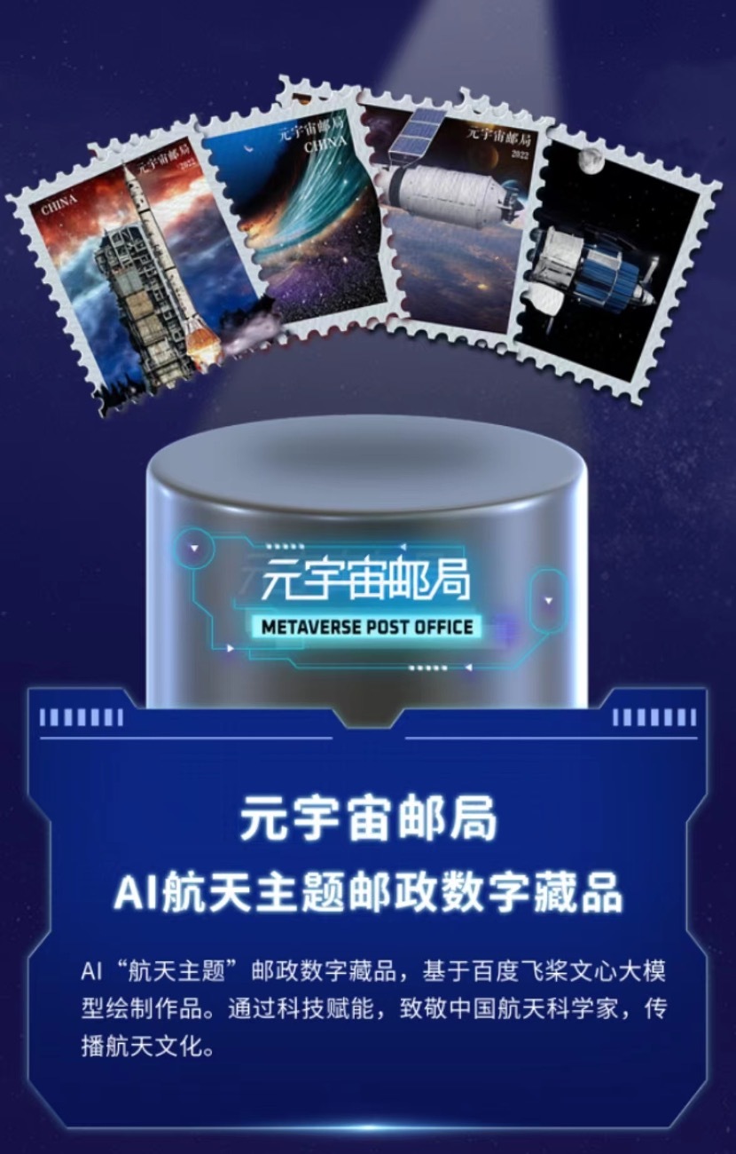 本次推出的全球首套AI“航天主题”邮政数字藏品,基于百度文心大模型创作内容。探索浩瀚宇宙,发展航天事业,建设航天强国,是我们不懈追求的航天梦。通过科技赋能,旨在致敬中国航天科学家,传播航天文化,弘扬“两弹一星”精神、载人航天精神、探月精神。我们的征途是星辰大海。