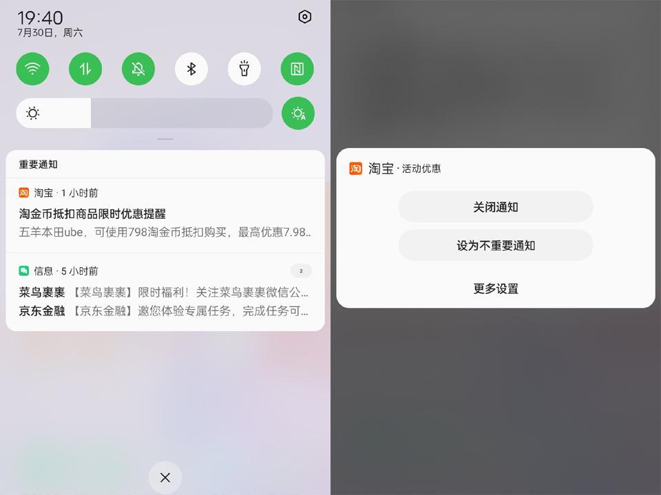除了通过系统在系统设置里对每个通知信息进行设计以外,我们还可以通过在下拉信息菜单里选择想要关闭的通知,轻轻向左滑动,就可以出现设置按钮,出现关闭通知以及设置为不重要通知两个选项。可以对通知的重要性进行设置,也可以直接禁止APP的通知推送。