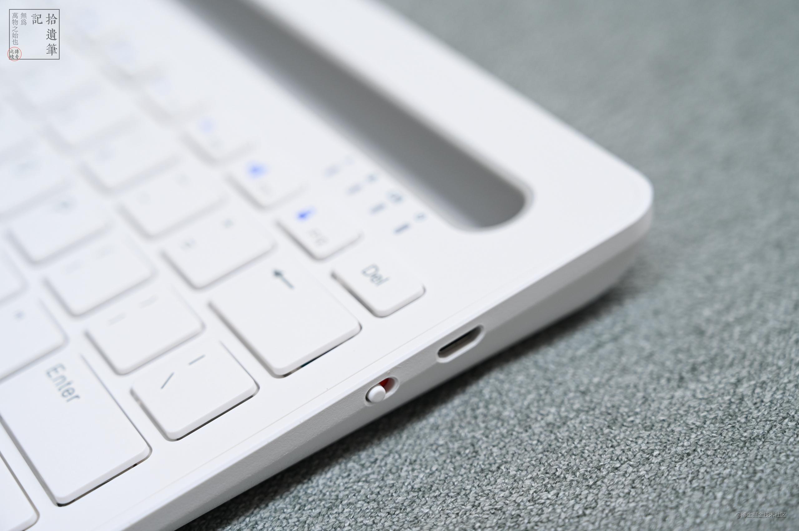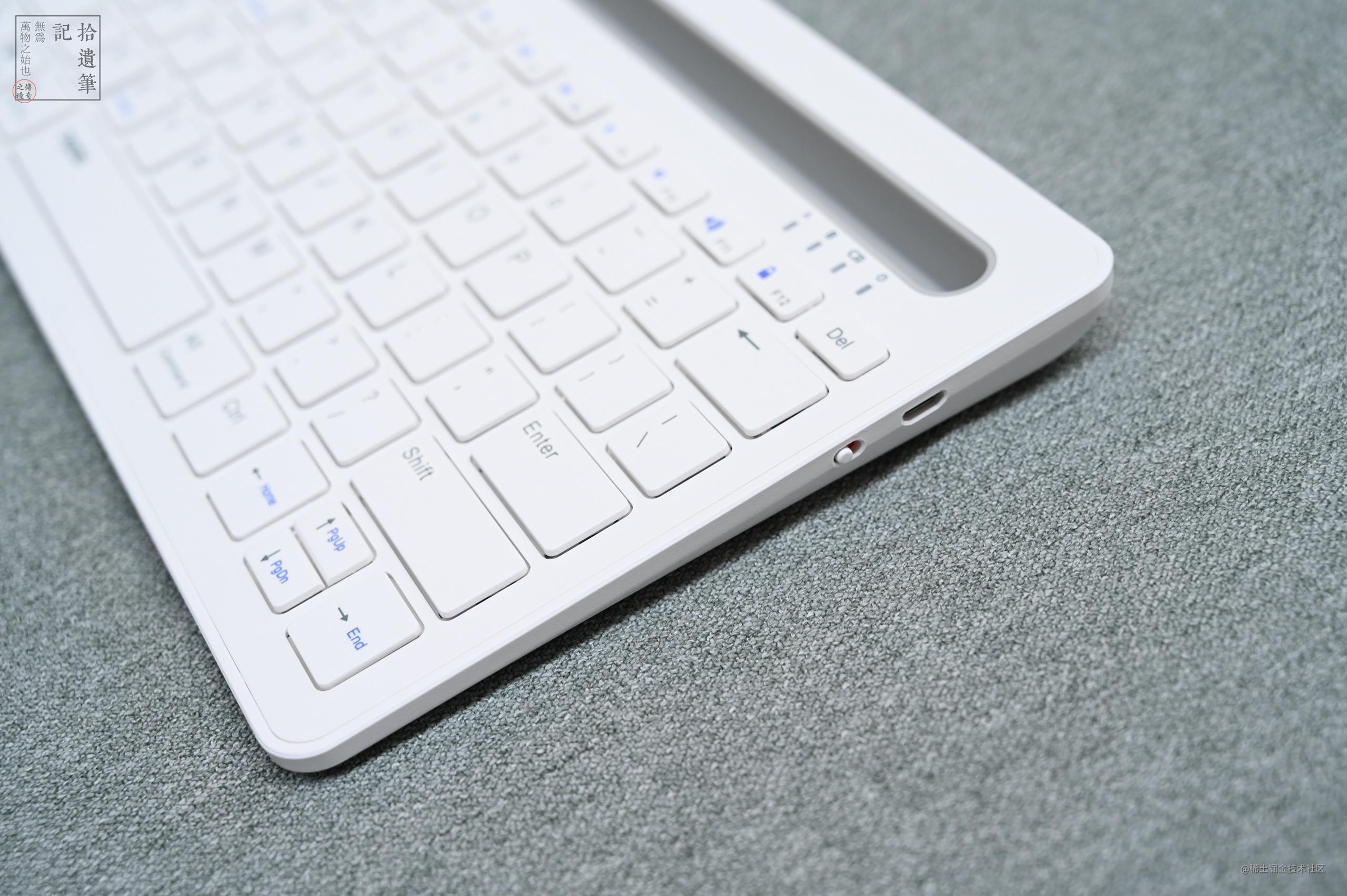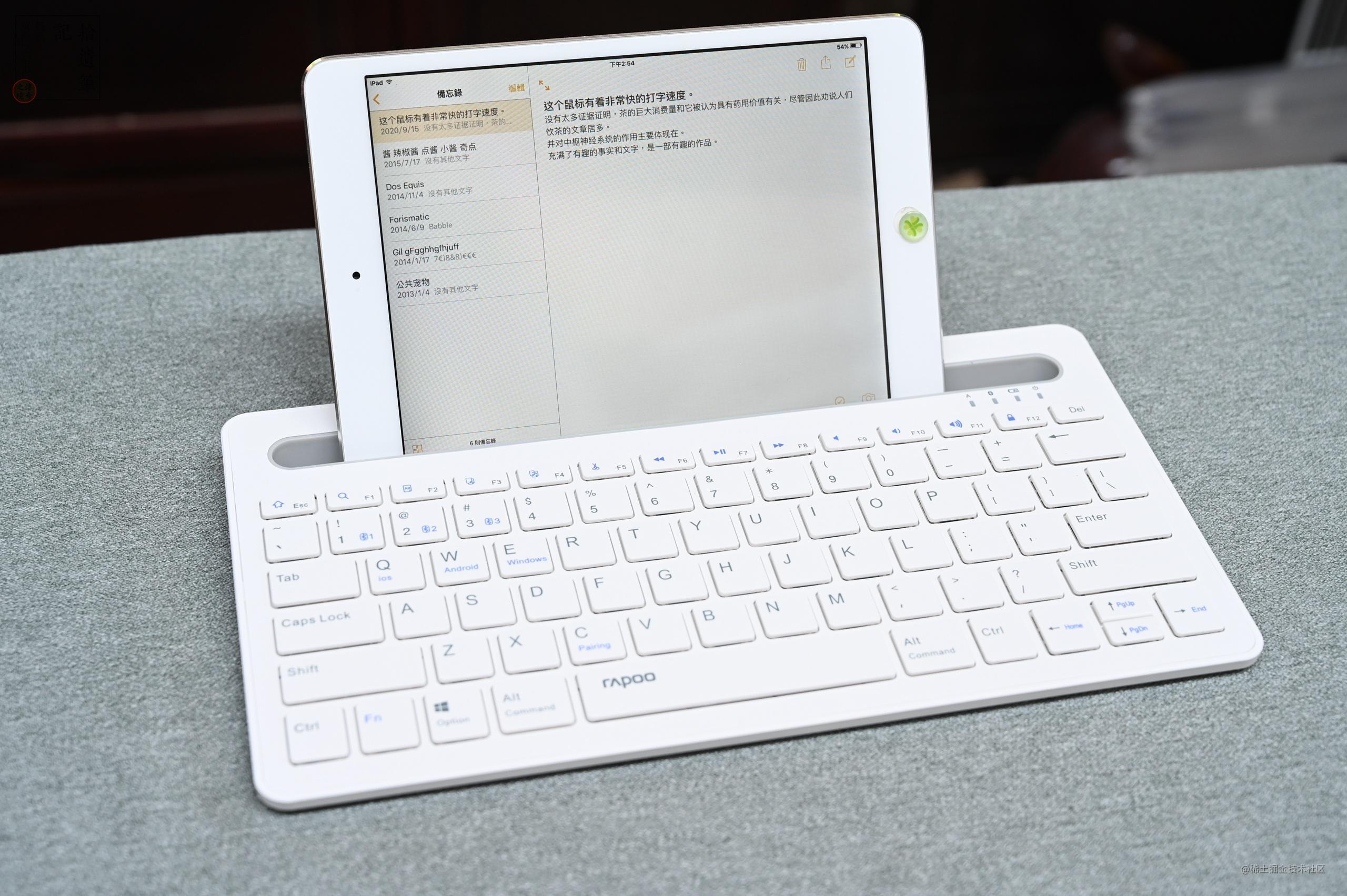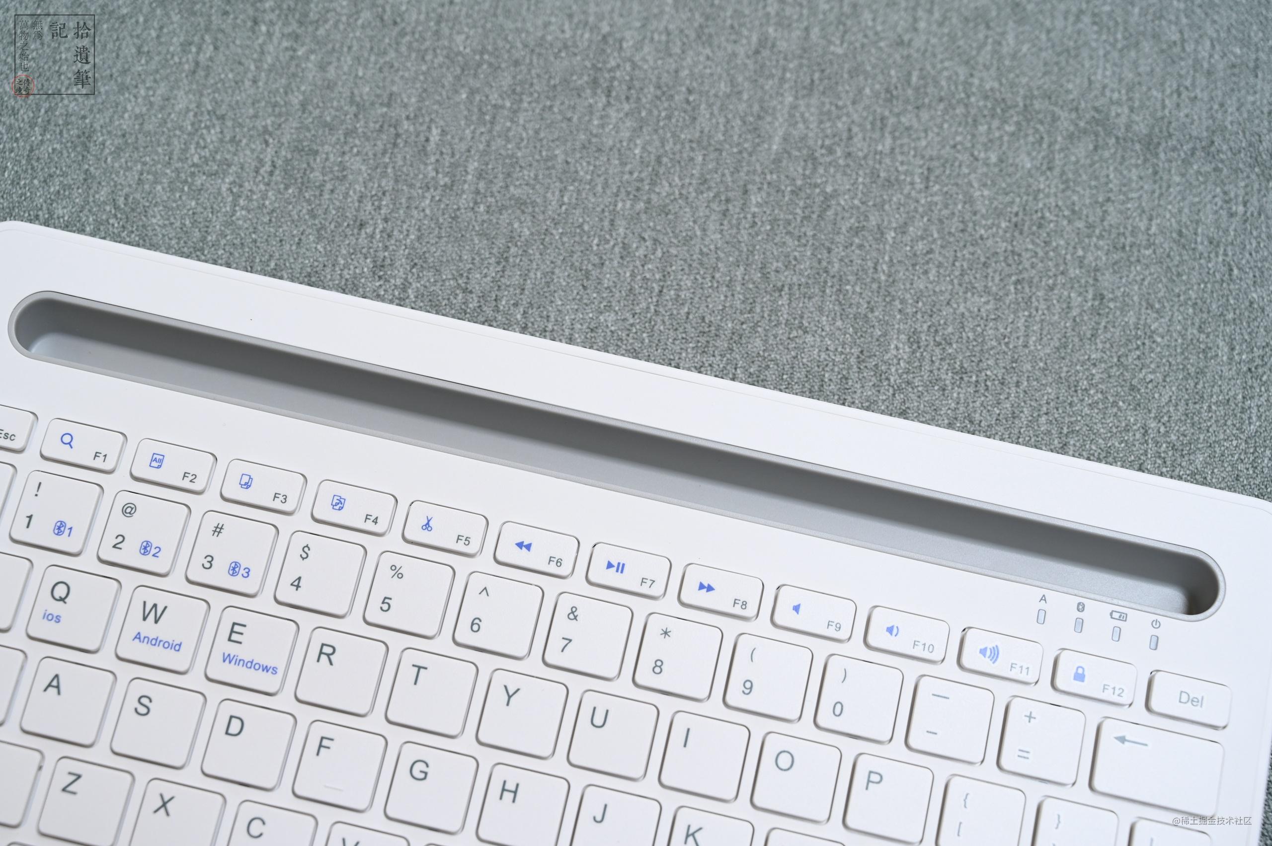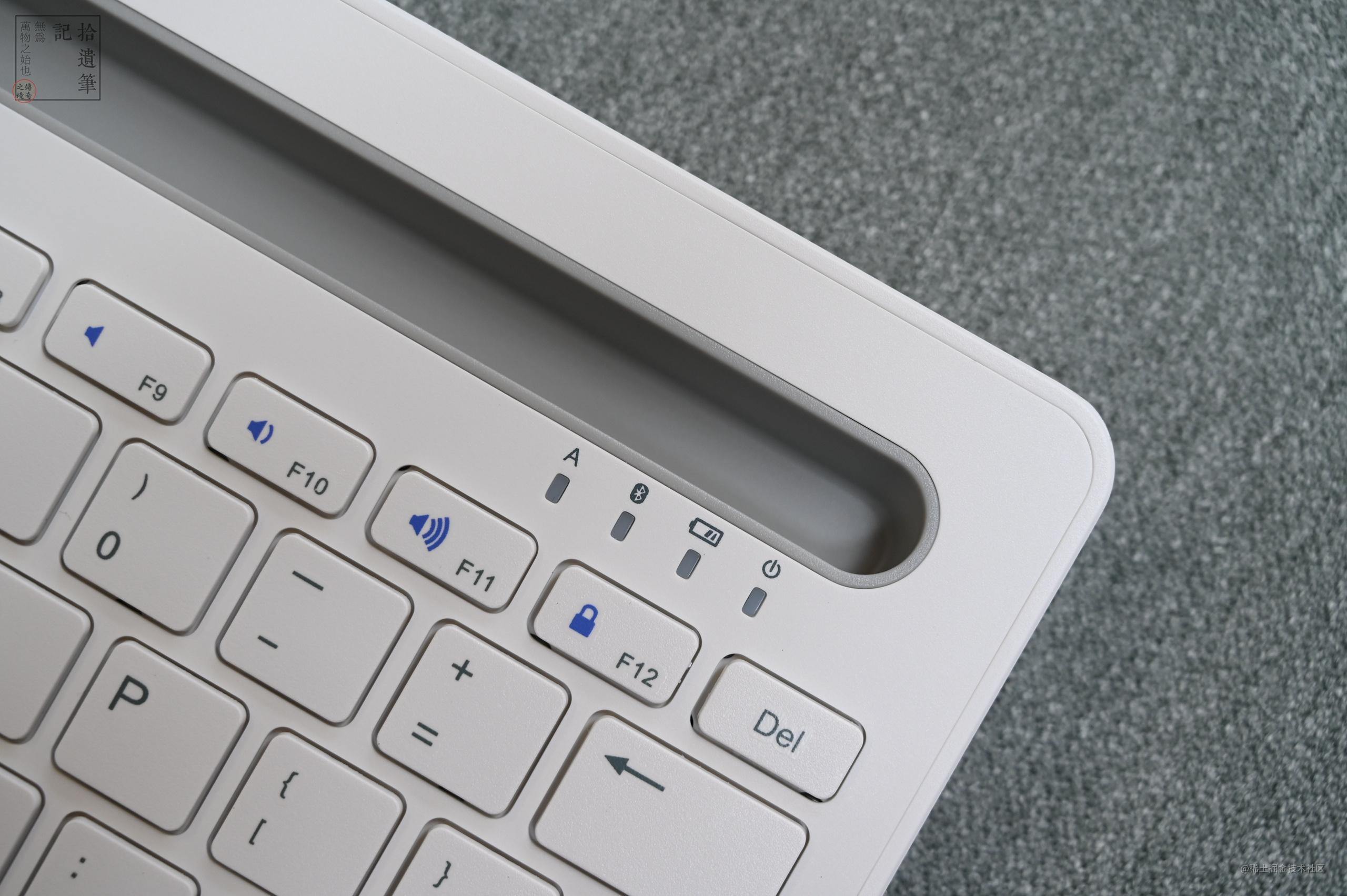 这款键盘的支架是我很喜欢的一点,这个插槽尺寸合理,宽度为12.5mm,即使是9.7寸的平板也可以轻松放下,使用时把手机、平板等设备放在上面时,刚好可以获得一定的仰角,方便我们查看,即使不打字的时候,把它单纯作为支架使用也没问题。