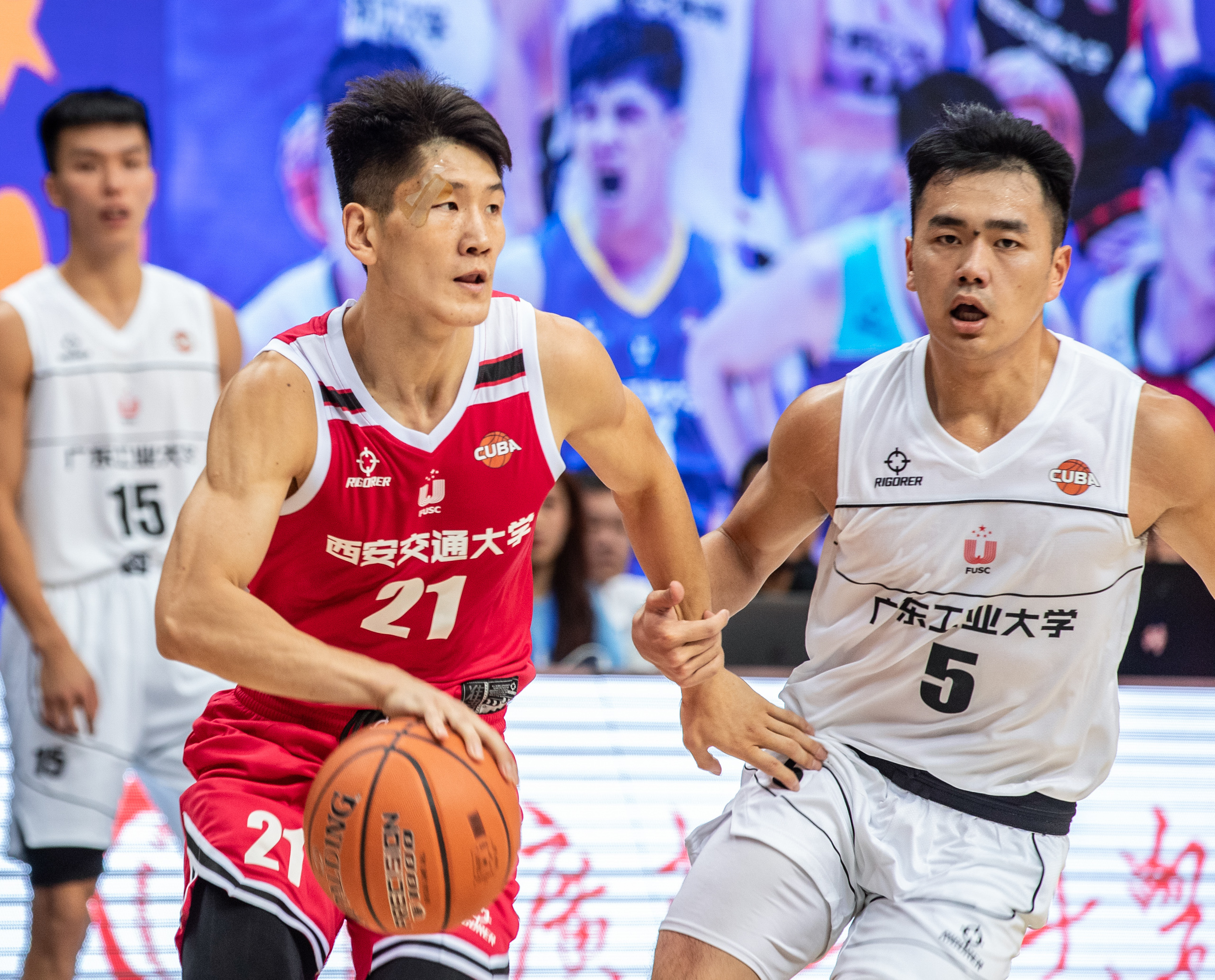 当日,在重庆市南岸区乐动力江南体育中心举行的第24届中国大学生篮球联赛(CUBA)男子组全国总决赛半决赛中,西安交通大学队对阵广东工业大学队。