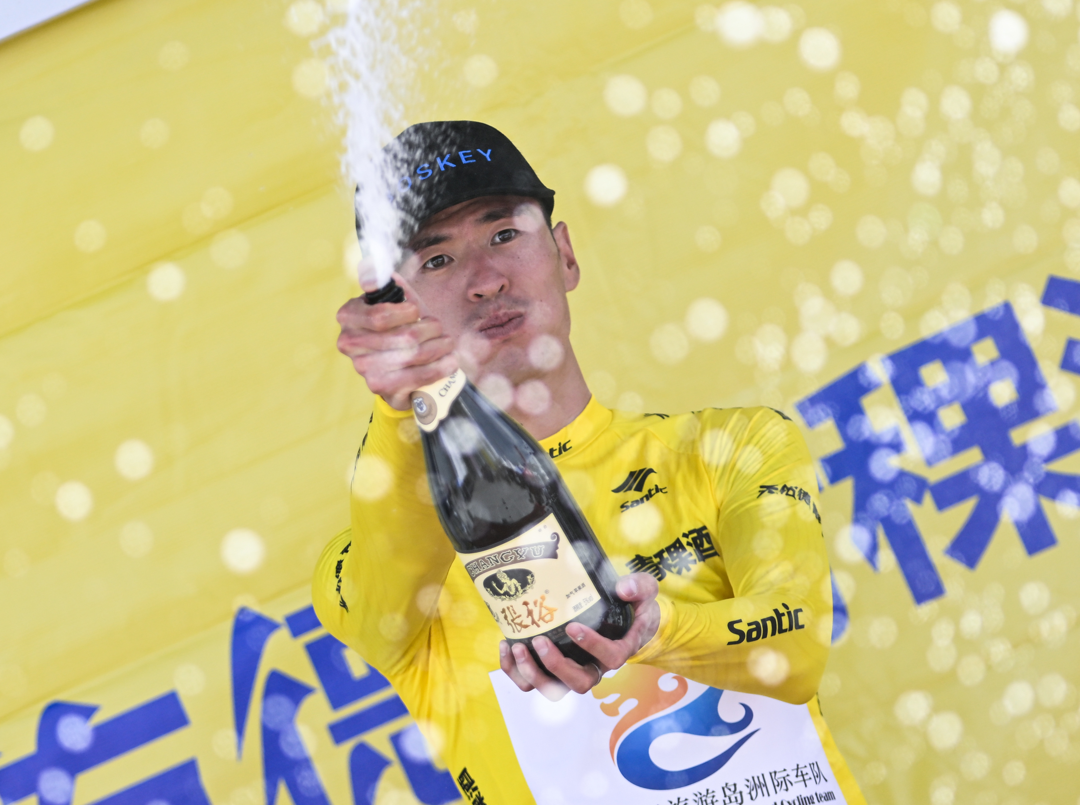 7月30日,平潭国际旅游岛洲际队选手刘建坤身着代表个人总成绩第一名的黄衫在领奖台上庆祝。新华社记者张龙摄