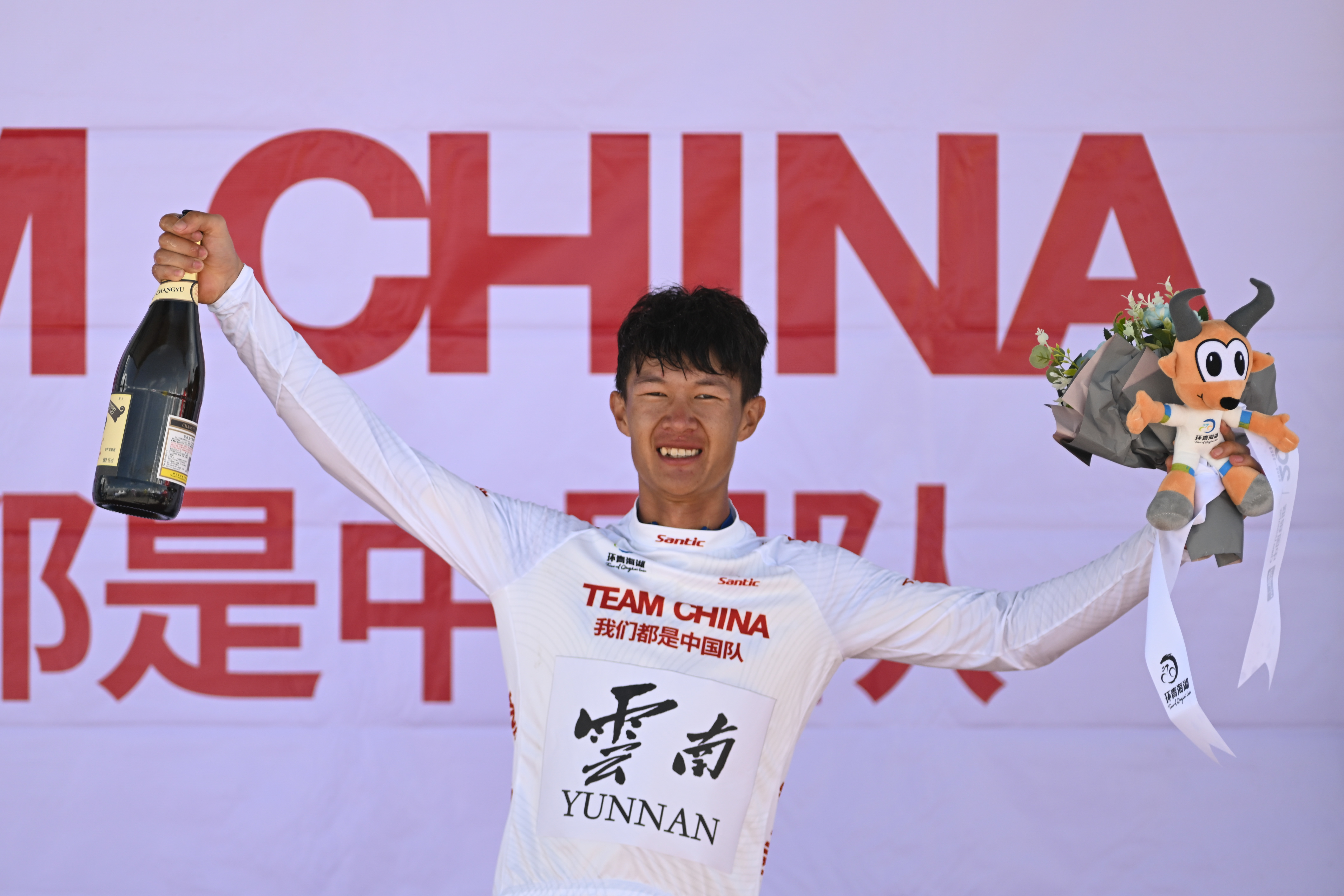7月30日,云南队选手李玉恒身着代表最佳青年选手的的白衫在领奖台上庆祝。新华社记者张龙摄