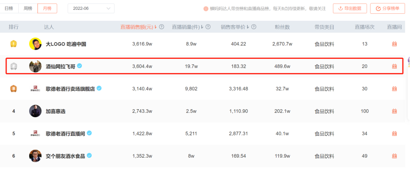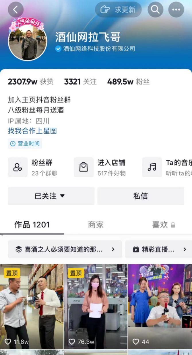 在抖音坐拥489.6万粉丝的拉飞哥,正是酒仙网旗下第一“大主播”,并已经成为酒水类目头部主播之一。