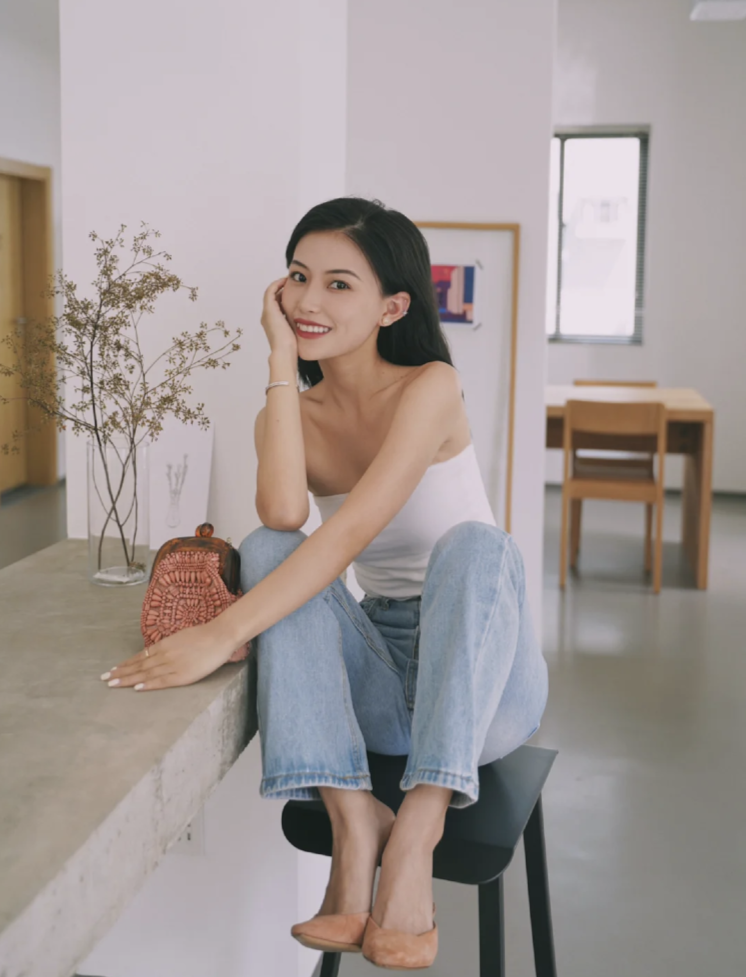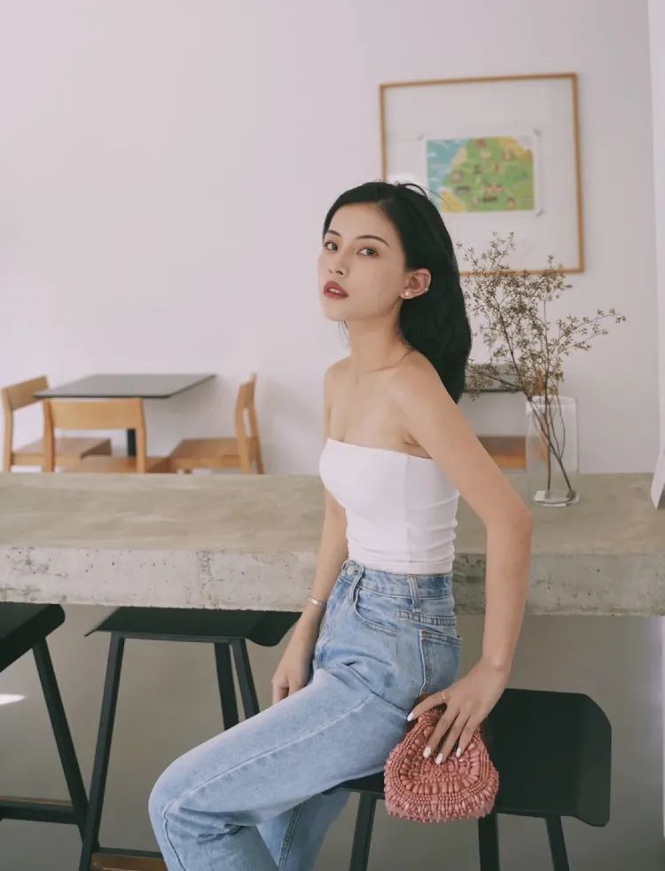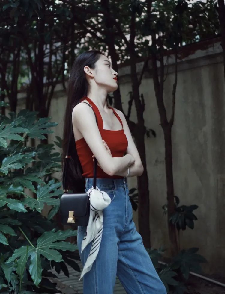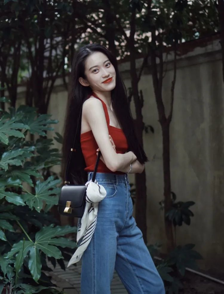 像港风最经典的红色吊带她用来搭配牛仔裤,包包上随意的丝巾点缀,既有港风的明艳感也不失现代的时髦感!