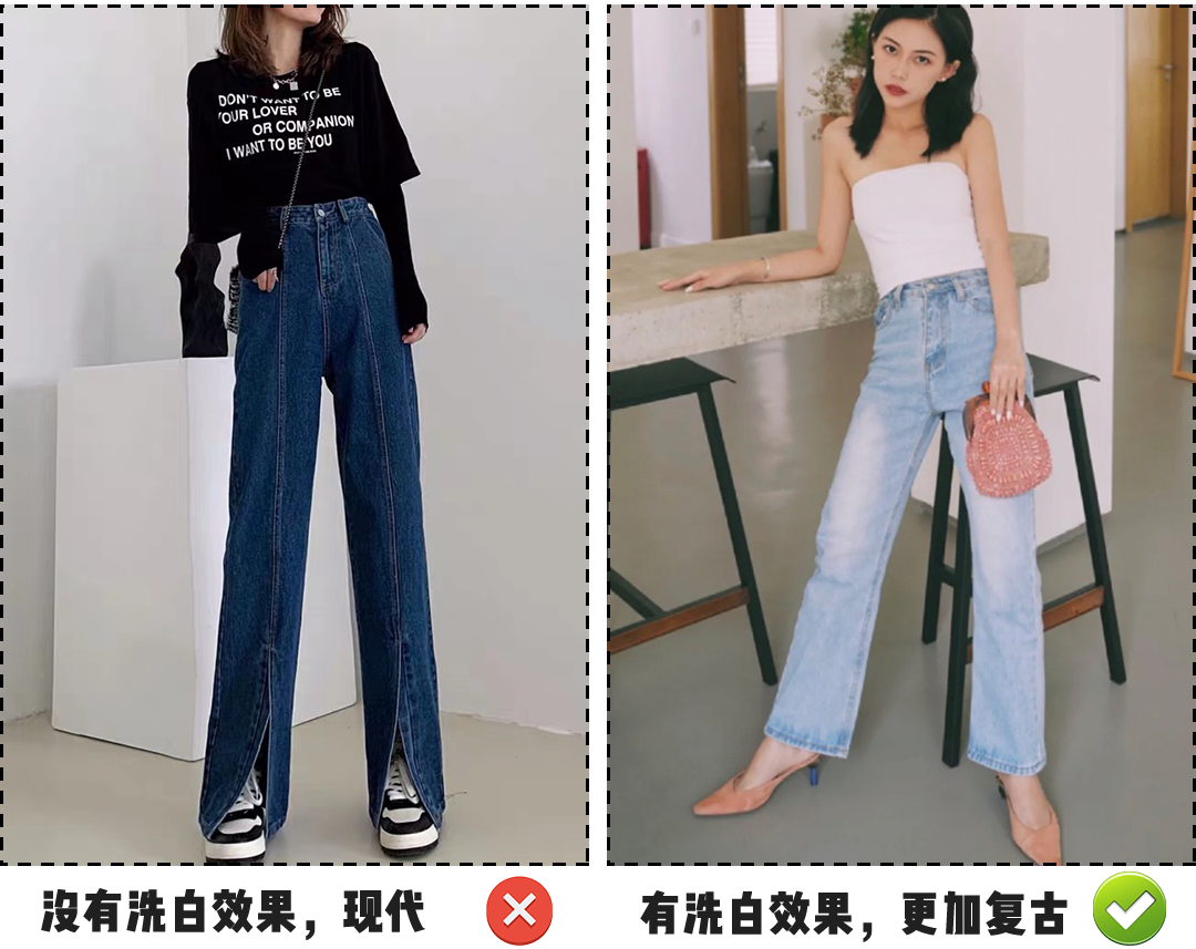 港风的牛仔裤除了版型以外,颜色也一定要选做旧靛蓝色