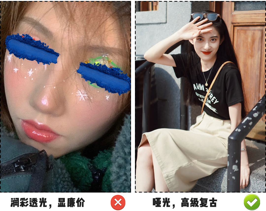 港风红唇的颜色是稳重饱和的, 我建议姐妹们 选择与妆面一致的哑光款 这样整体妆容会更加精致,艳而不俗